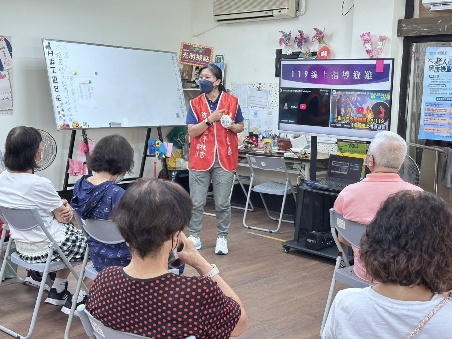 為了提升長輩防災意識,光明據點特別邀請知本消防單位蒞臨,舉辦「防災宣導及家庭逃生演練」。現場由消防宣導員以生動的簡報與實例分享,帶領大家認識居家安全的重要性,並學習火災發生時的正確應變方式。長輩們都專心聆聽,並踴躍提出疑問。