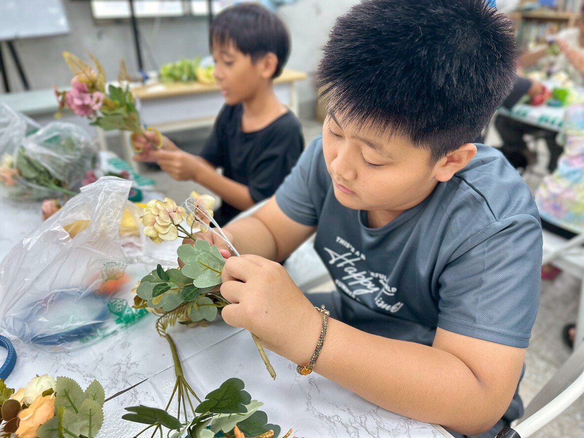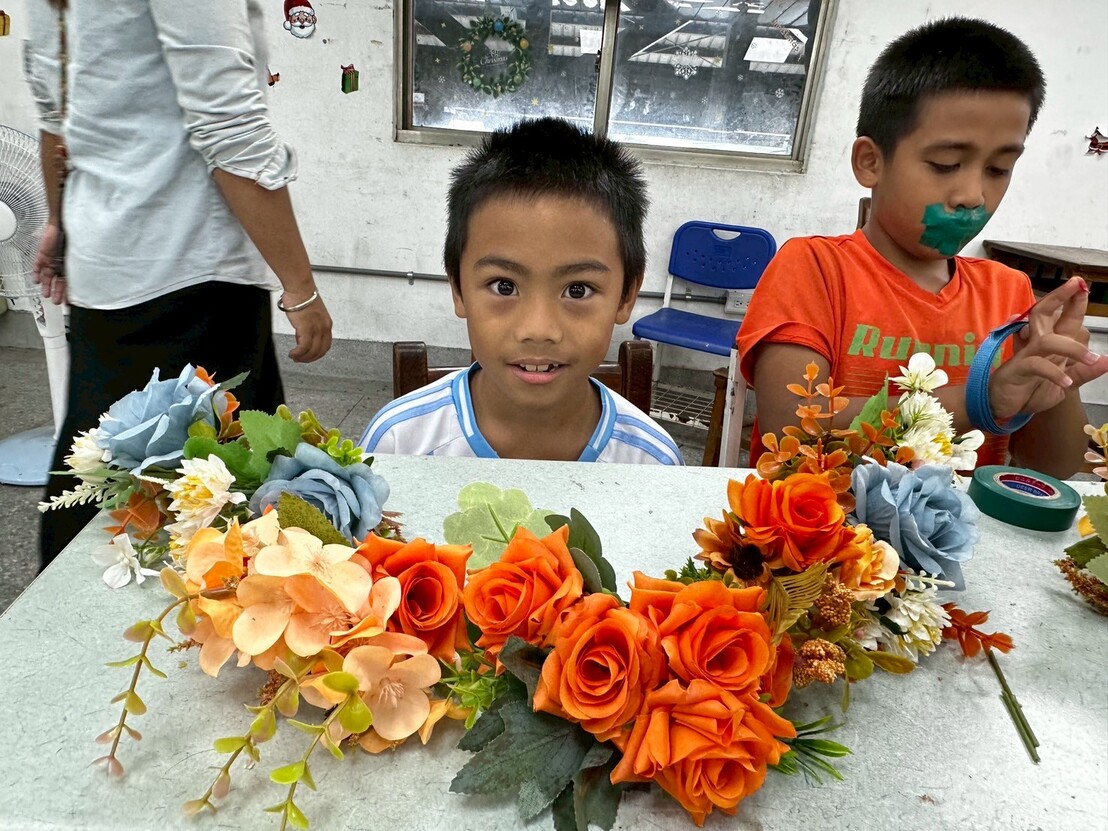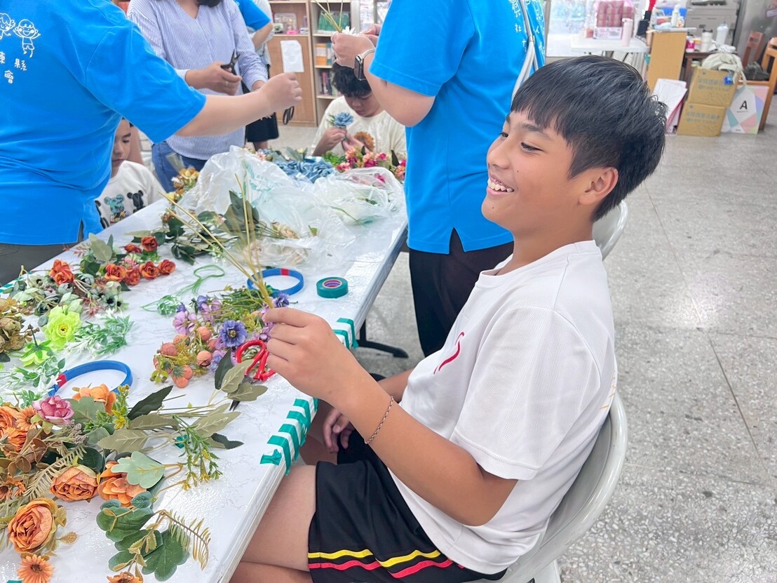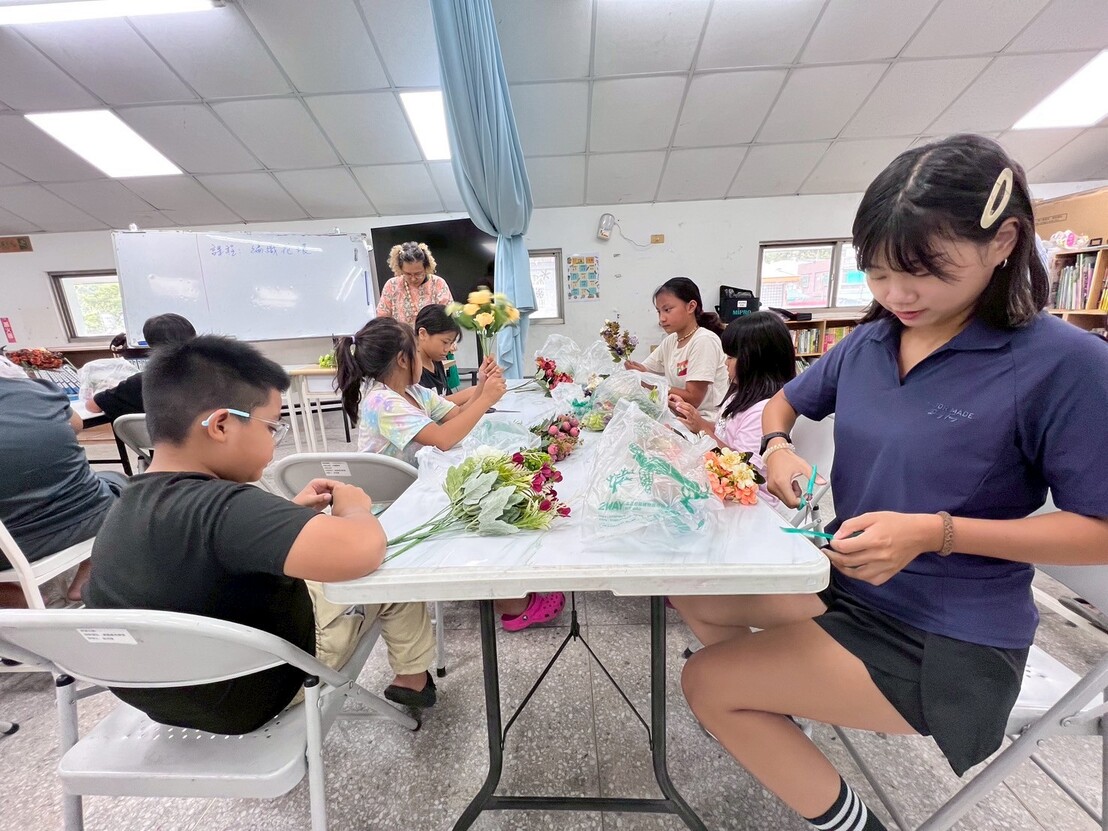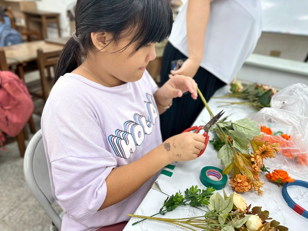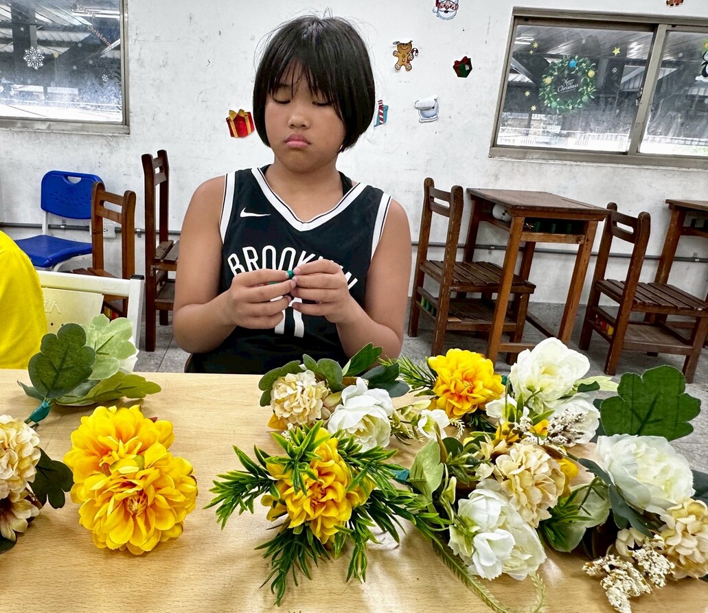 接著進入實作。剪花的步驟雖然簡單,但要把花朵捆成一小束一小束,對孩子們來說可是個挑戰。他們需要思考花的長度和搭配方式,雖然有點困難,但大家依然努力完成屬於自己的小花束。