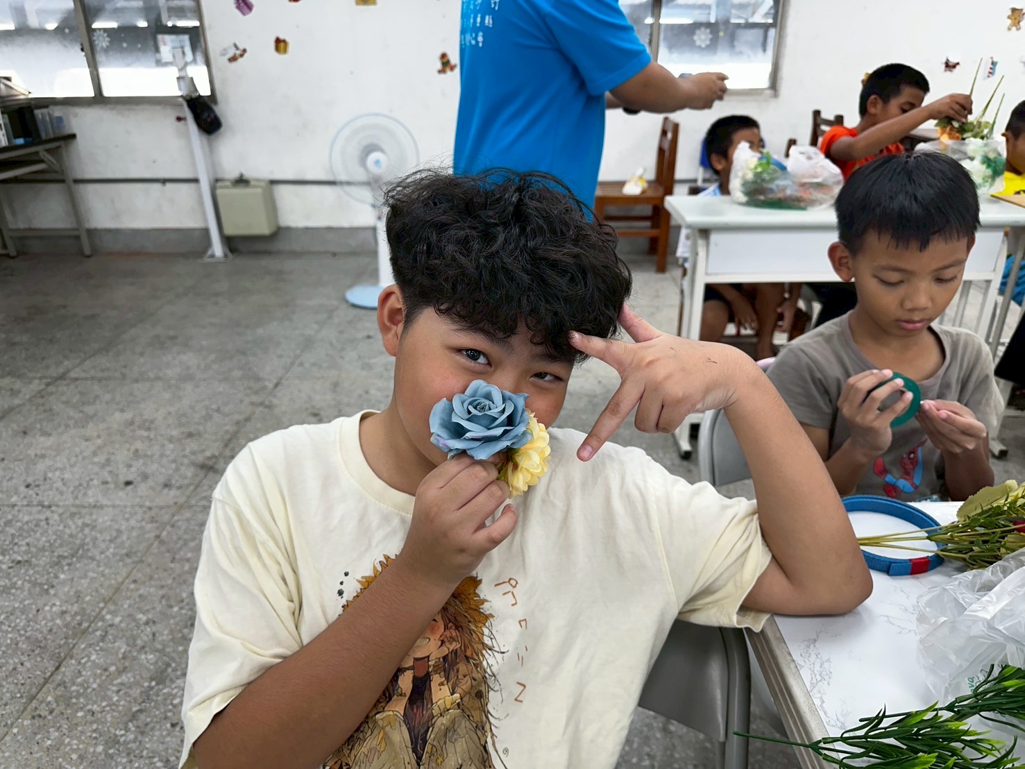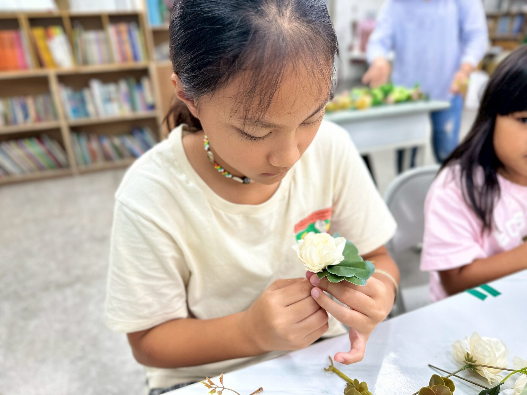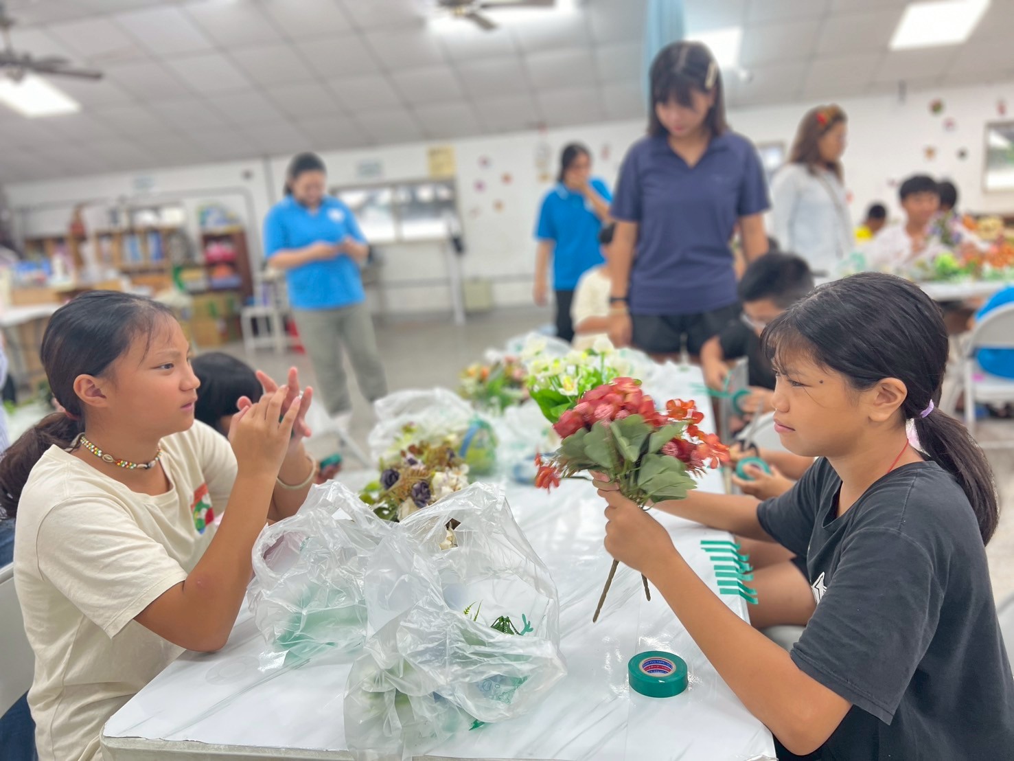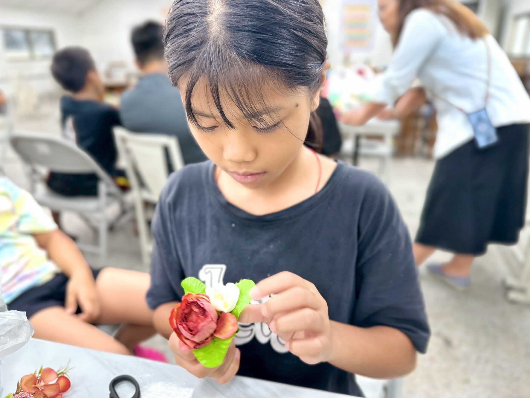 接著進入實作。剪花的步驟雖然簡單,但要把花朵捆成一小束一小束,對孩子們來說可是個挑戰。他們需要思考花的長度和搭配方式,雖然有點困難,但大家依然努力完成屬於自己的小花束。