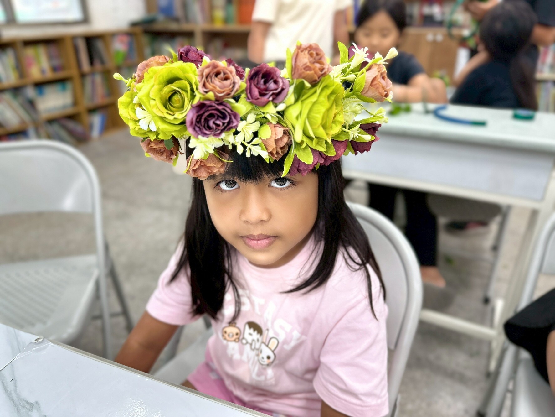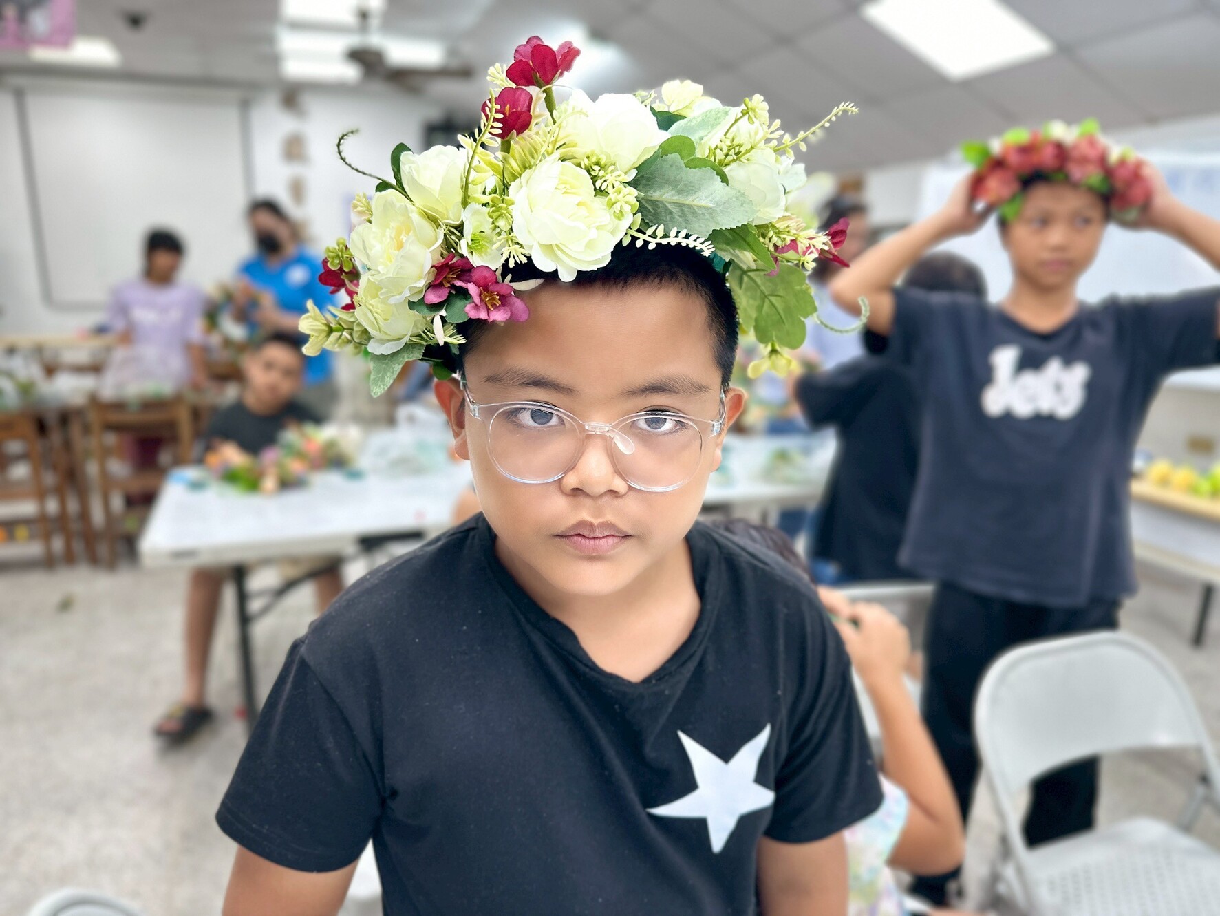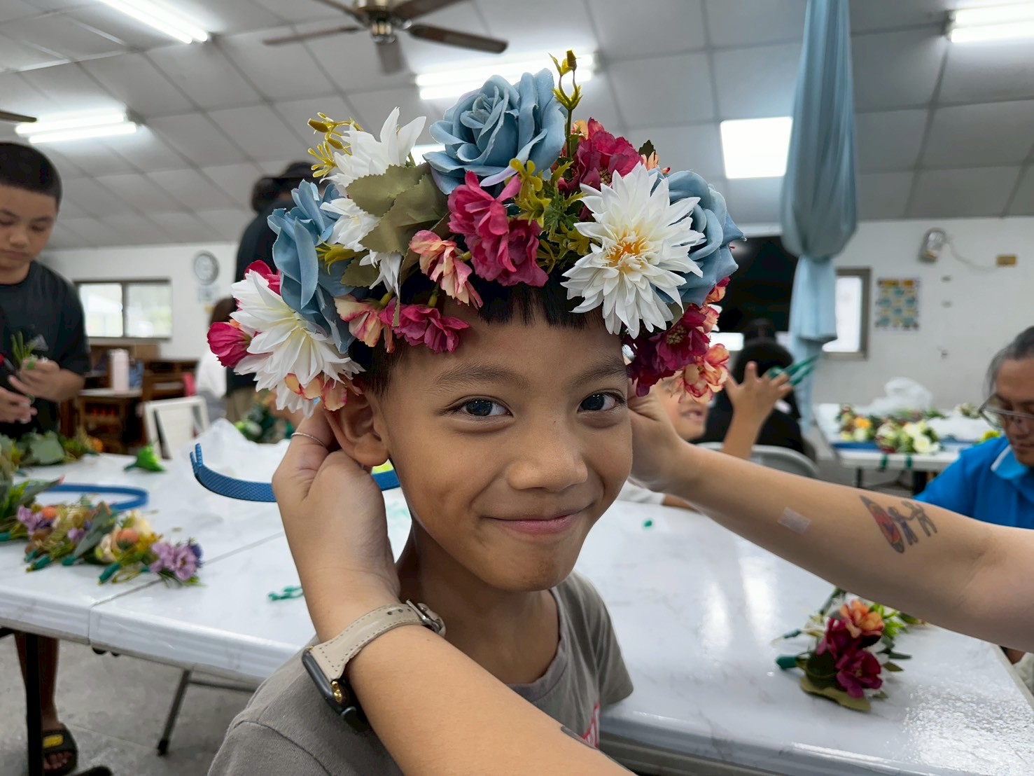 最後進入最關鍵的部分——編製頭花。這一階段需要兩人合作,一人捆綁、一人協助拉繩,在同心協力下,每個孩子都做出了一頂獨一無二的頭花。