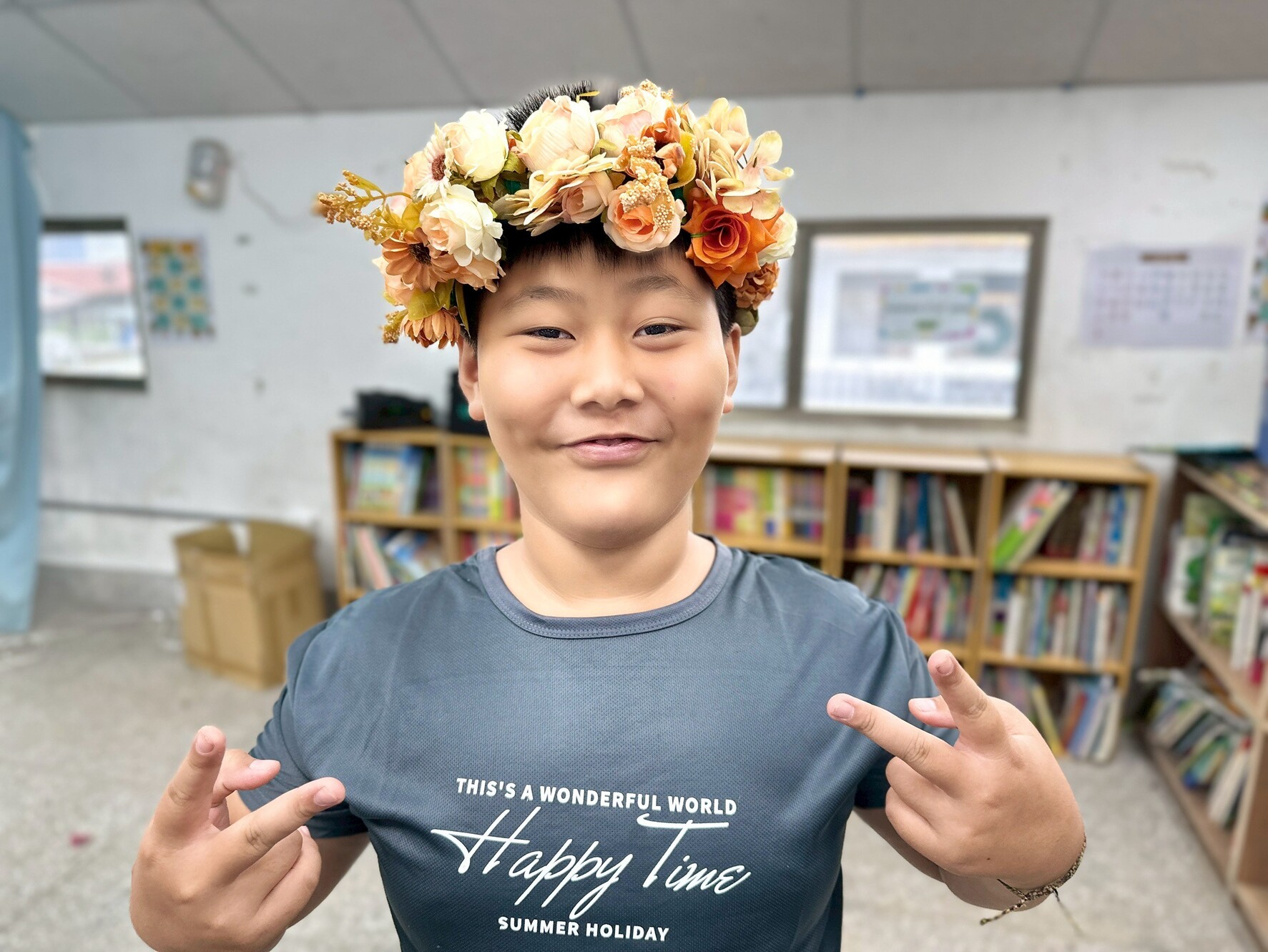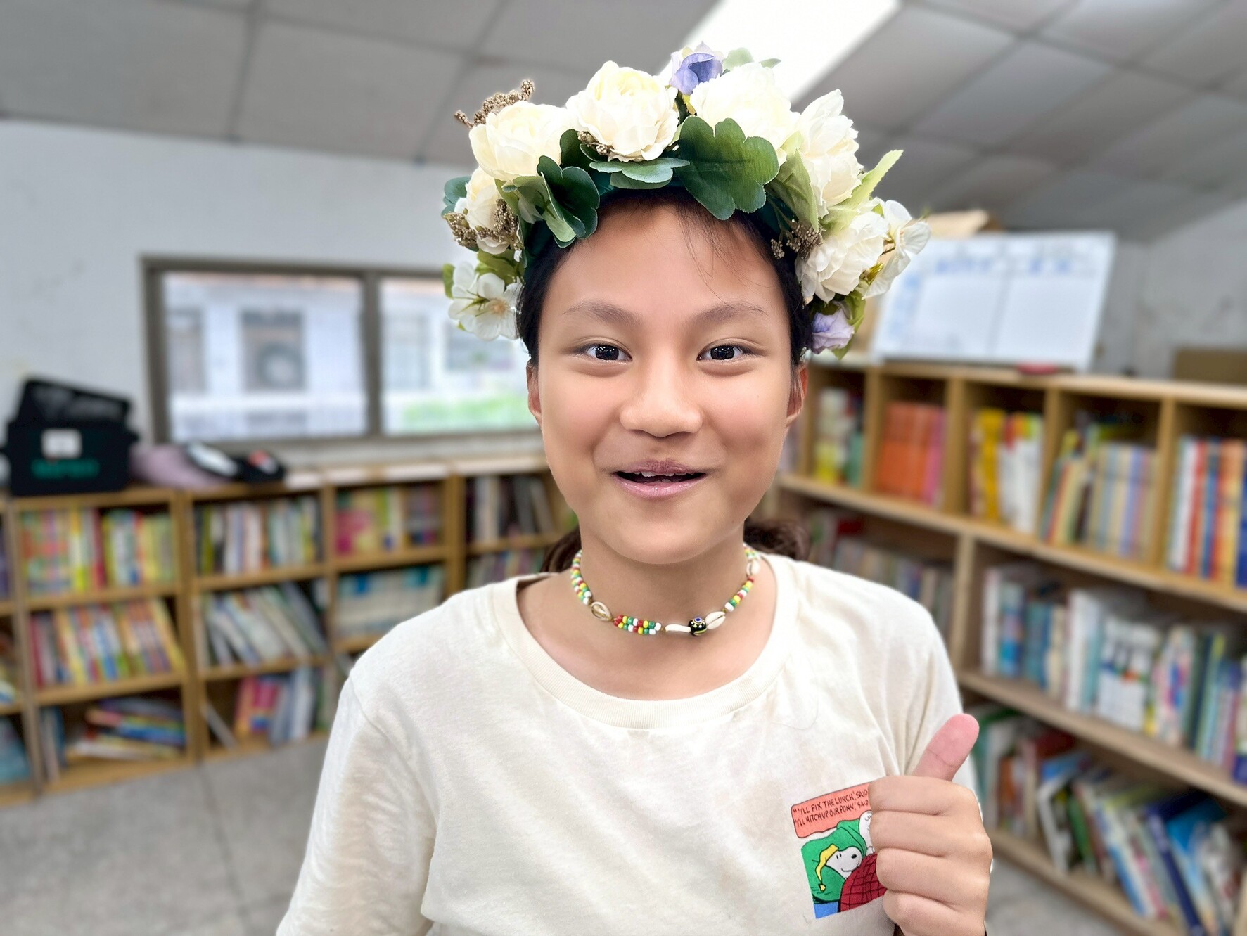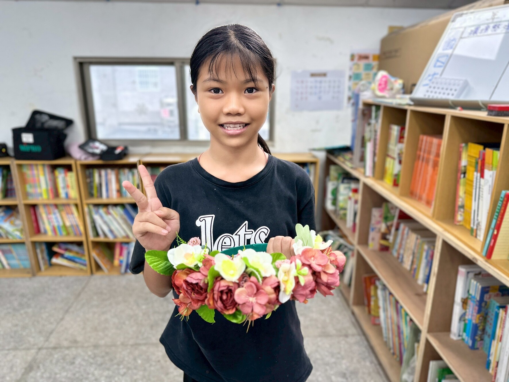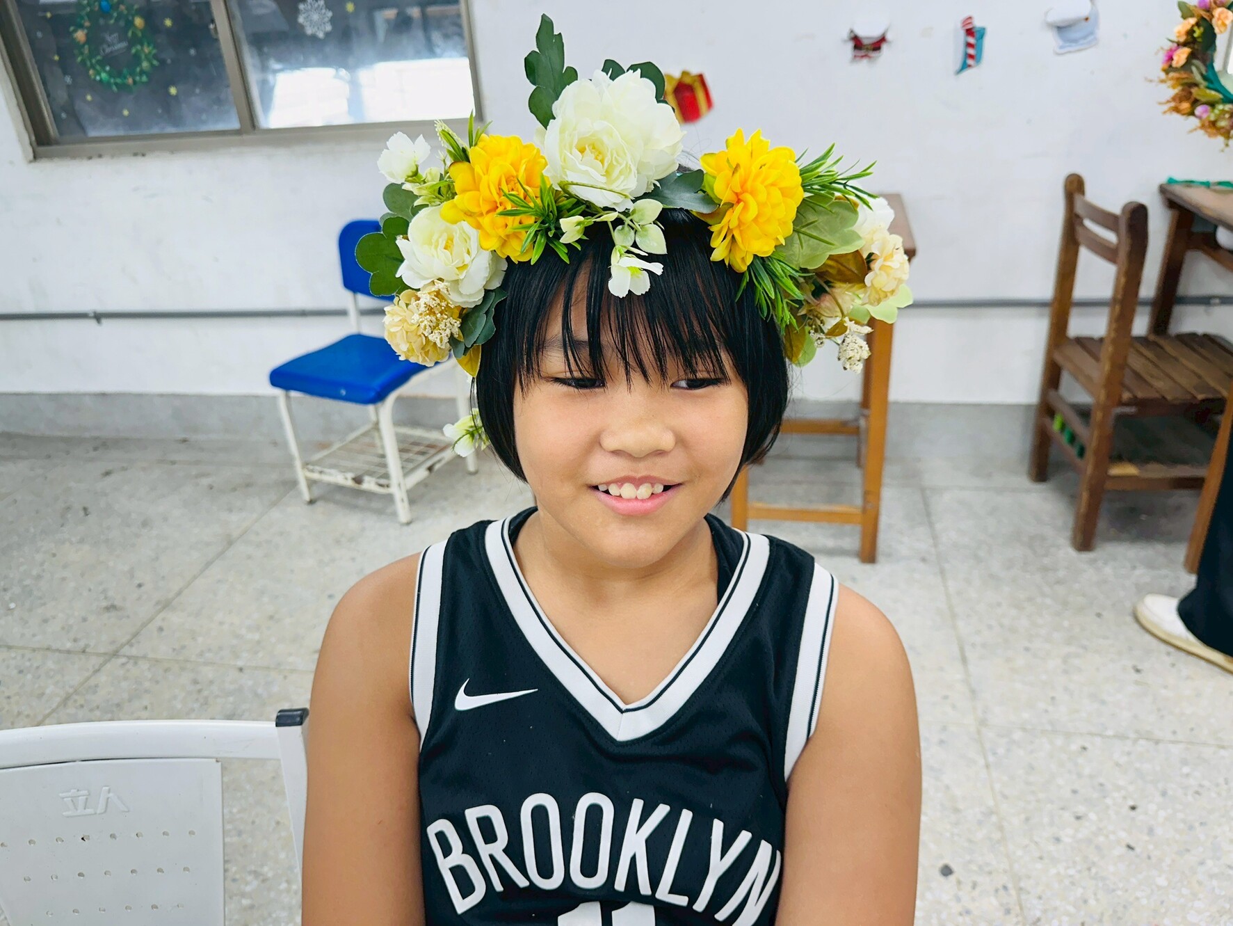 最後進入最關鍵的部分——編製頭花。這一階段需要兩人合作,一人捆綁、一人協助拉繩,在同心協力下,每個孩子都做出了一頂獨一無二的頭花。
