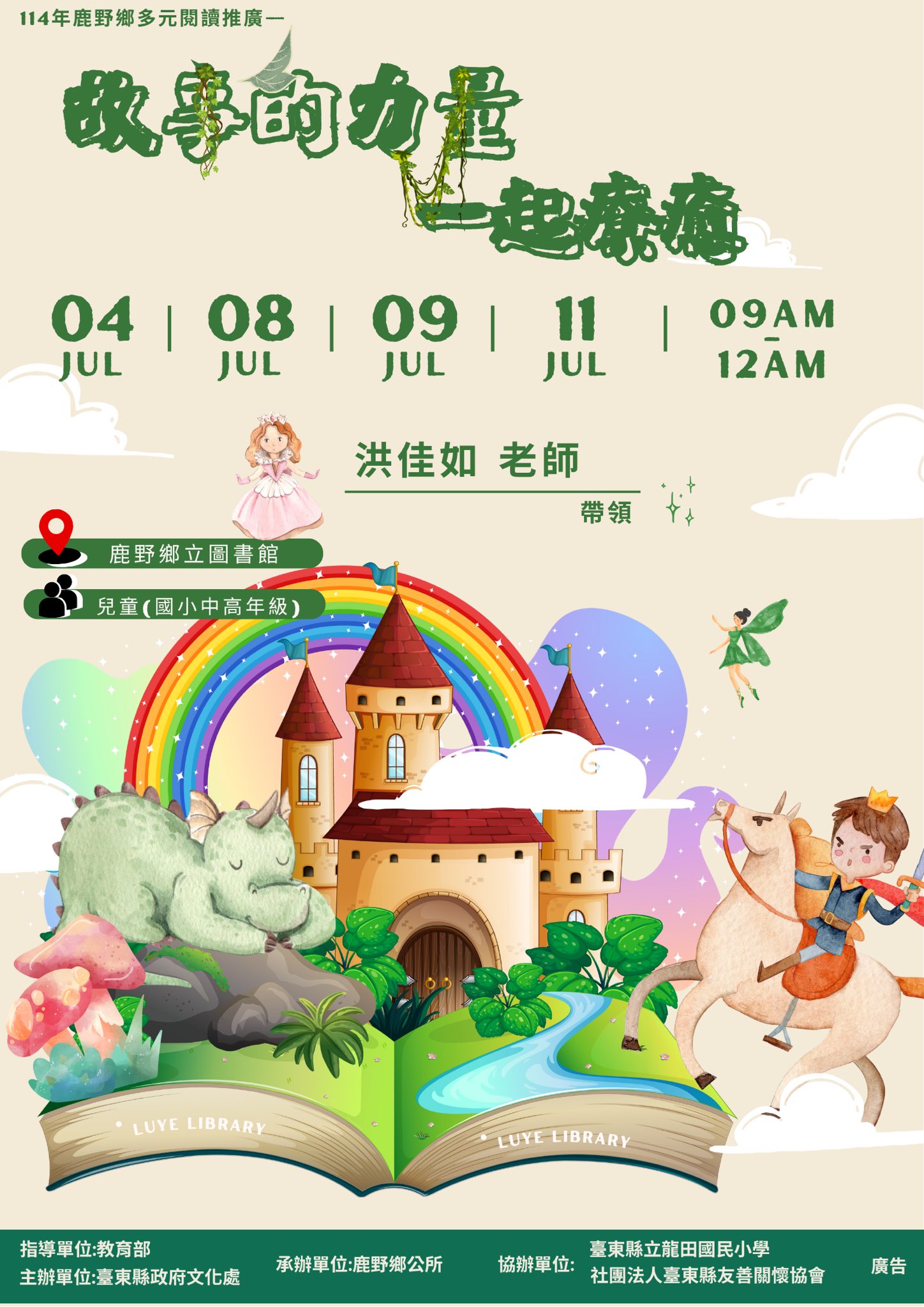 故事的力量是推動閱讀的重要動力,透過講師的講述,激發孩童對閱讀的興趣,並培養閱讀習慣。感謝鹿野鄉圖書館、感謝龍田國小、感謝龍田村村長連結、感謝洪佳如老師一同辦理鹿野鄉多元閱讀推廣—「故事的力量:一起療癒」,為孩子們的暑假帶來豐富多彩的課程。