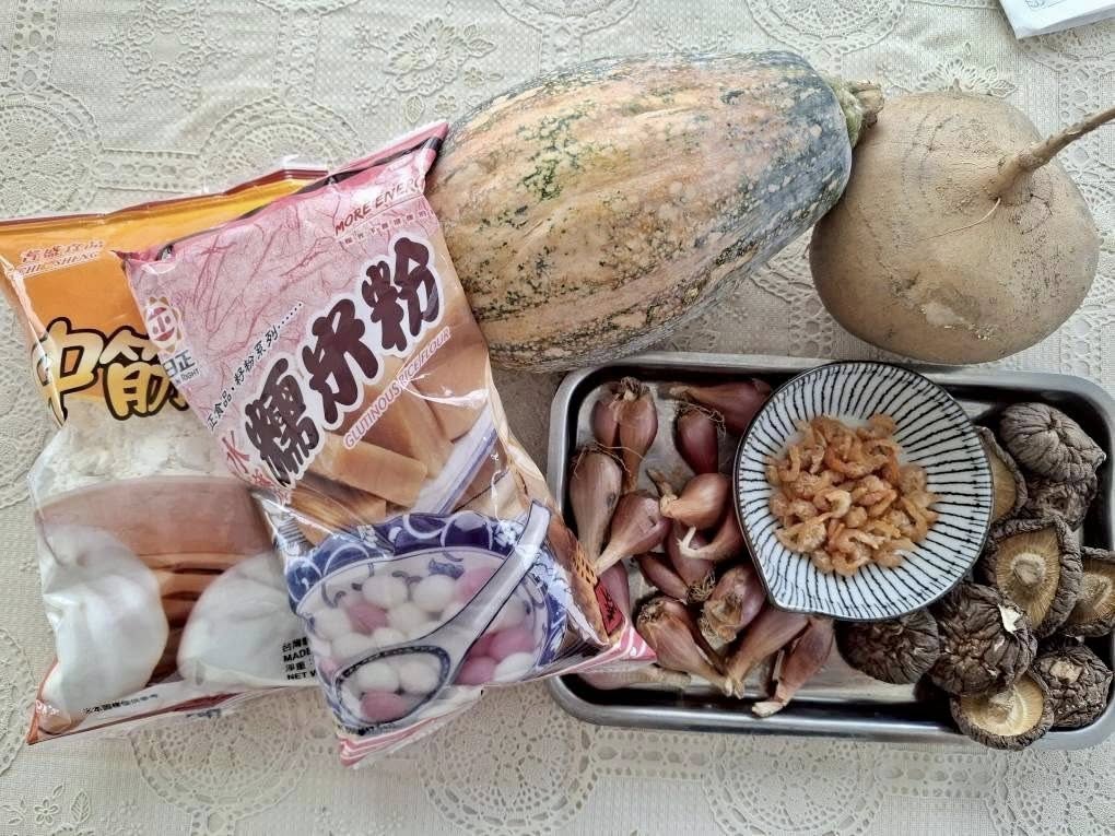 糯米粉、麵粉、南瓜以及內餡的豆薯、紅蔥頭、蝦米、豬肉、香菇。