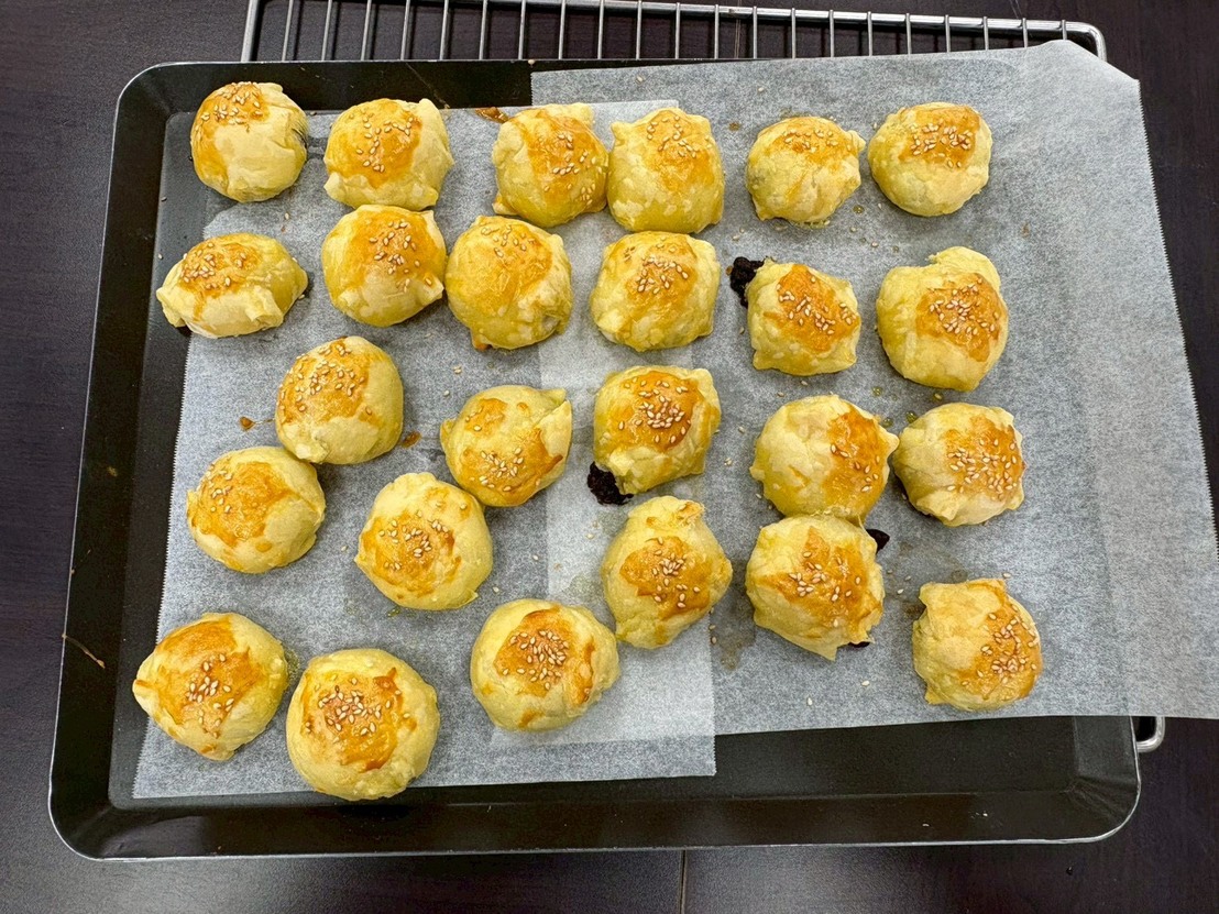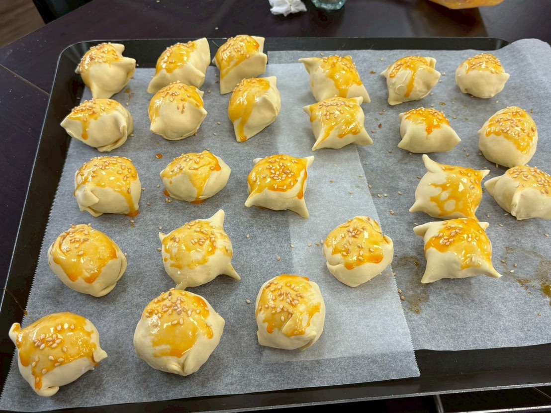 接著大家一起製作創意的 酥皮元宵,把煮好的湯圓包進酥皮裡,刷上蛋液,灑些芝麻,再送進烤箱。