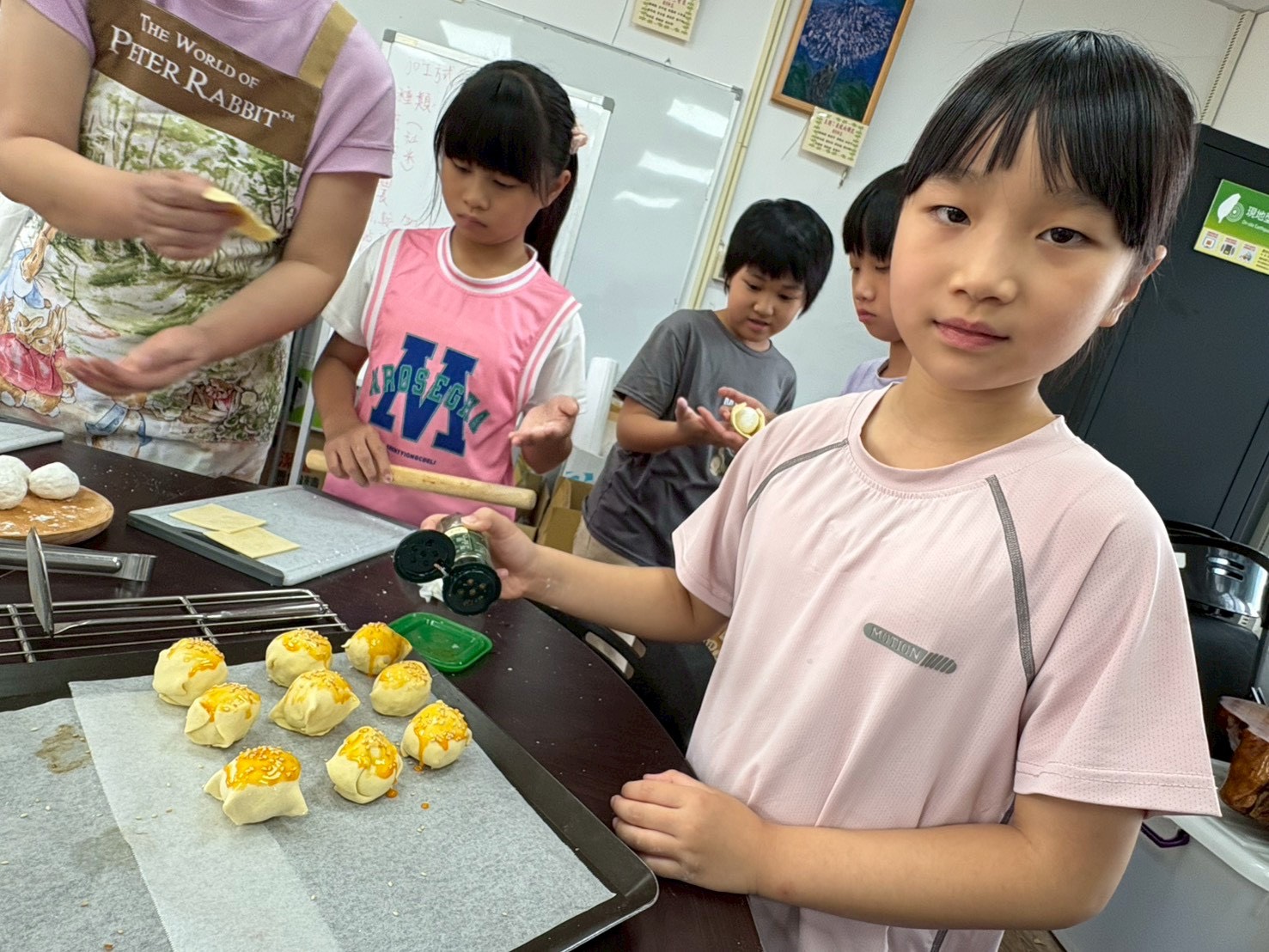 當酥皮慢慢膨起、香氣飄出來時,孩子們都迫不及待想嚐嚐自己的作品。