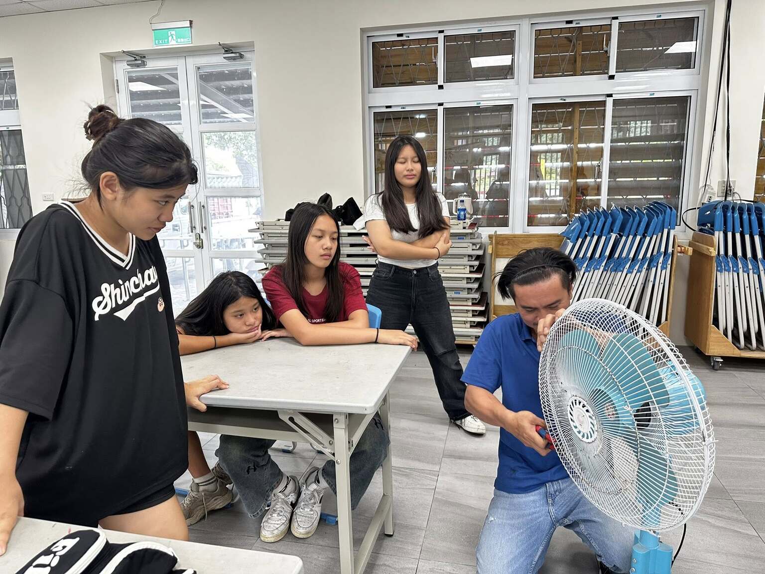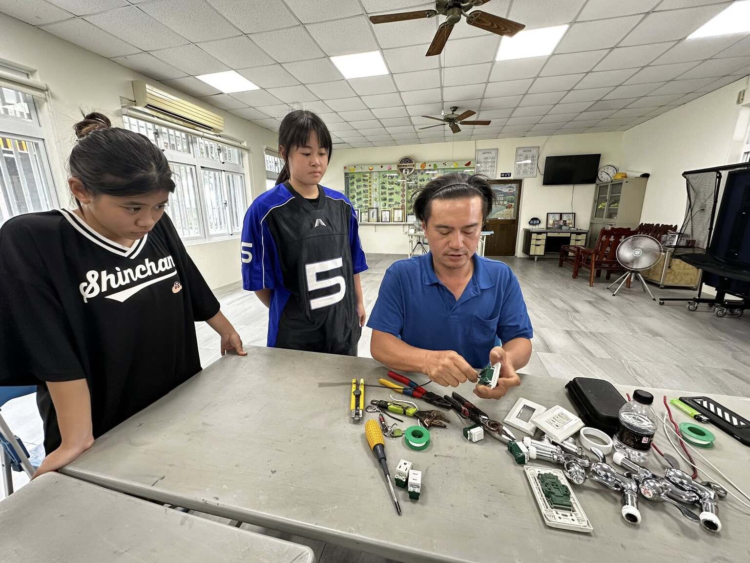 現場實際更換社區活動中心的插座和開關,電風扇都拆解重組,嘗試找出問題並解決問題,小志工們完成超有成就感的任務!